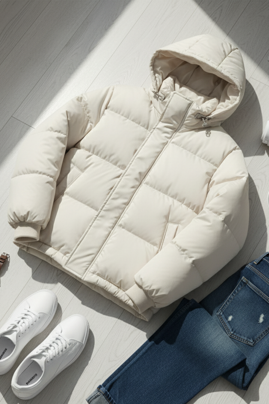 Kurtka Puchowa z Kapturem i Pikowanym Wzorem | Mateusz – Kremowa